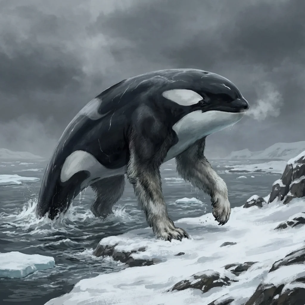 Akhlut is a Monster of Arctic lore — a sea-wolf hybrid that combines the bulk and drive of a cetacean with the lithe, deliberate movements of a terrestrial predator. In the field it reads as a single living force: dense, warm muscle sheathed in oily fur and blubber that glistens with brine. Smell: a sharp saline tang threaded with fish oil and cold kelp. Sound: a layered voice — low exhalations like whale breath that can snap into wolf-like barks or a high, keening cry across the ice. Temperature: palpably warm and animal, not spectral; it radiates the solid heat of a running predator rather than an otherworldly chill. Notes written in the margins often compare its presence to the hush that falls when both sea and shore hold their breath.