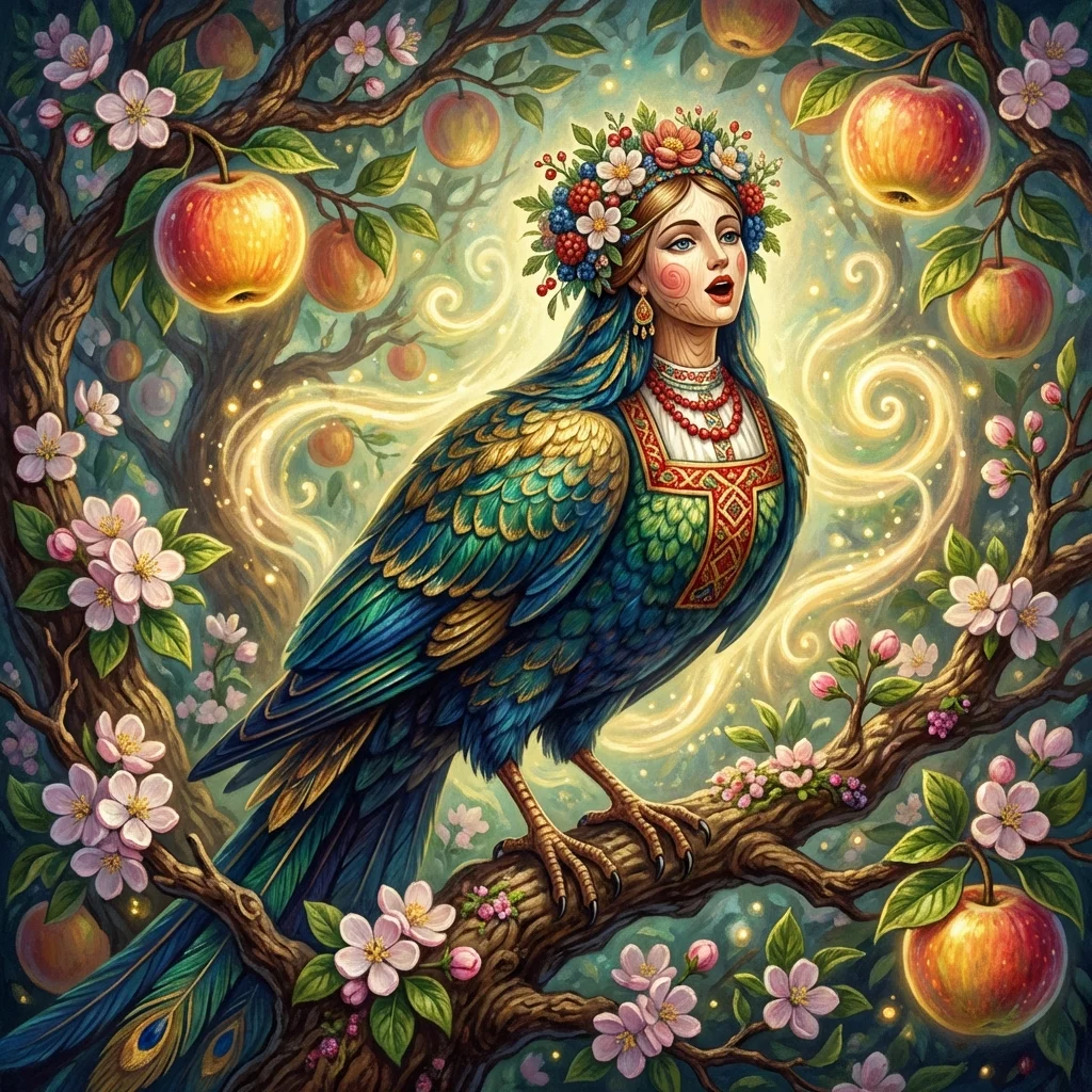 Alkonost is a Fae—an avian spirit that inhabits the borderlands of sea and birch grove. In the field she reads like a myth made flesh: a faint, oily scent of wet feathers and summer grass hangs in the air; her song is a crystalline, bell‑clear aria that pulls the world inward and makes listeners forget small griefs and old names; the temperature around her falls a degree or two, an uncanny coolness like dusk under leaves, as if the world takes a breath to listen.