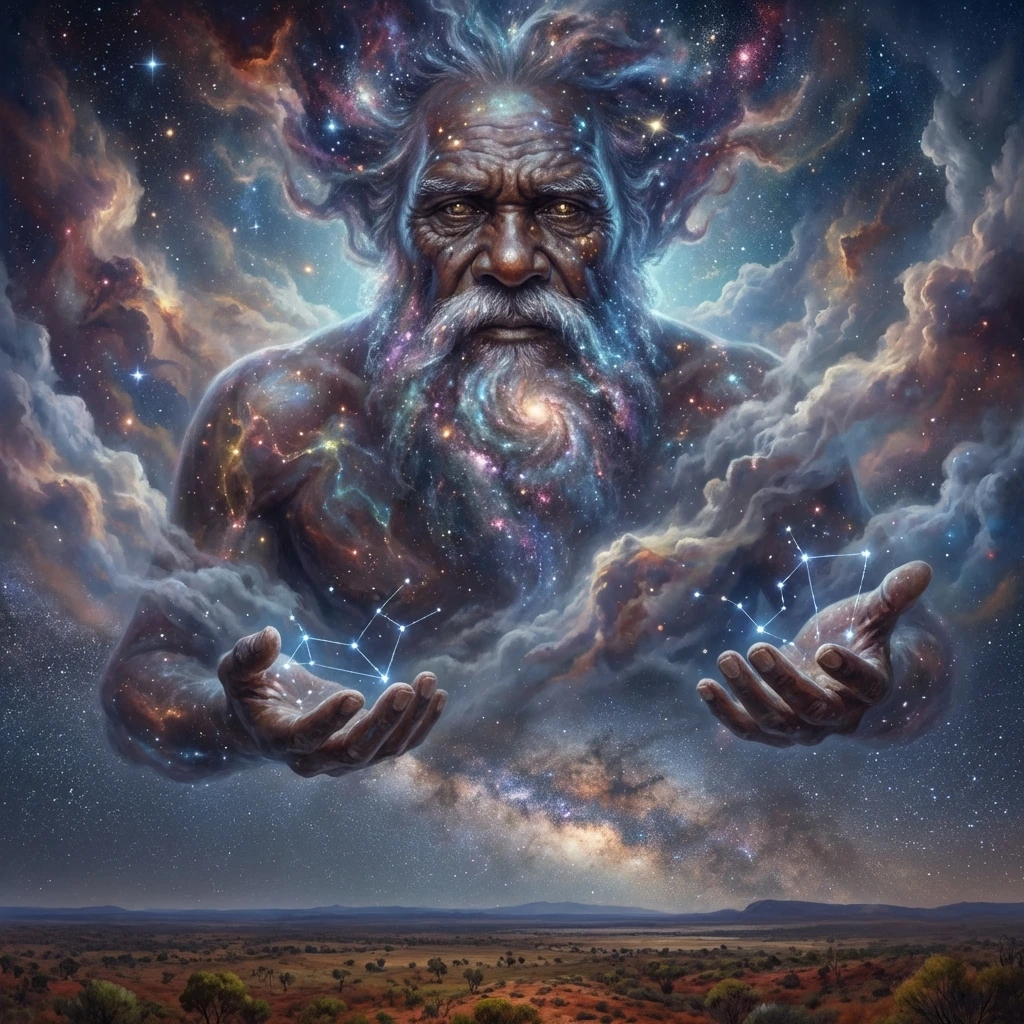 Baiame is a Deity — the Sky‑Father and creator figure remembered across several eastern Australian nations. Smell: the dry, clean tang of rain on eucalyptus and the faint ember‑smoke of hearths carried on a cool breeze. Sound: a low, patient resonance—like distant thunder or the cadence of ancestral song rolling over flat country. Temperature: cool and vast, an expansive presence that chills the cheek and lengthens the horizon. A field naturalist notes not a single visible form but landscape signatures: straight pathways, bora rings, and rock paintings that mark where his law and shaping of country were once told and made manifest.