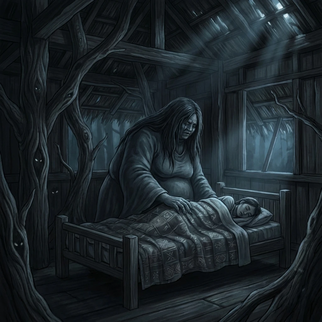 Batibat is a hostile household spirit often tied to old trees or reused timber. Field notes record it as an incorporeal presence that produces a localized, bone-deep cold rather than heat; the air around a Batibat smells of damp wood, mildew and loam with a faintly sweet note of rot; sounds associated with it are low and wet — a slow rustle, the soft sucking of breath, or the creak of settled timber. Observers report a heavy pressure on the chest of sleepers and vivid nightmare imagery, though no visible mass is required to apply that weight. Habitually encountered at night in dark, damp homes made from salvaged posts or stumps, it behaves like a predatory spirit that seeks hosts while they sleep.