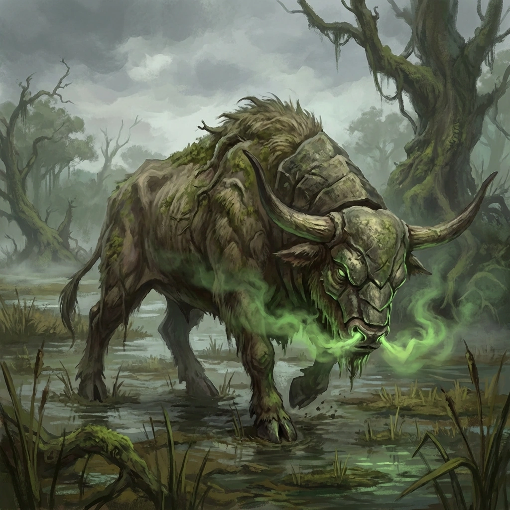 The creature's diet consists of poisonous scrub and venomous roots. This toxicity permeates its biology. When the Catoblepas exhales or sighs, it releases a cloud of necrotic gas. This breath is capable of corroding skin and liquefying the lungs of anyone unfortunate enough to be downwind. Even if one avoids the gaze, the air around the beast is a kill zone.